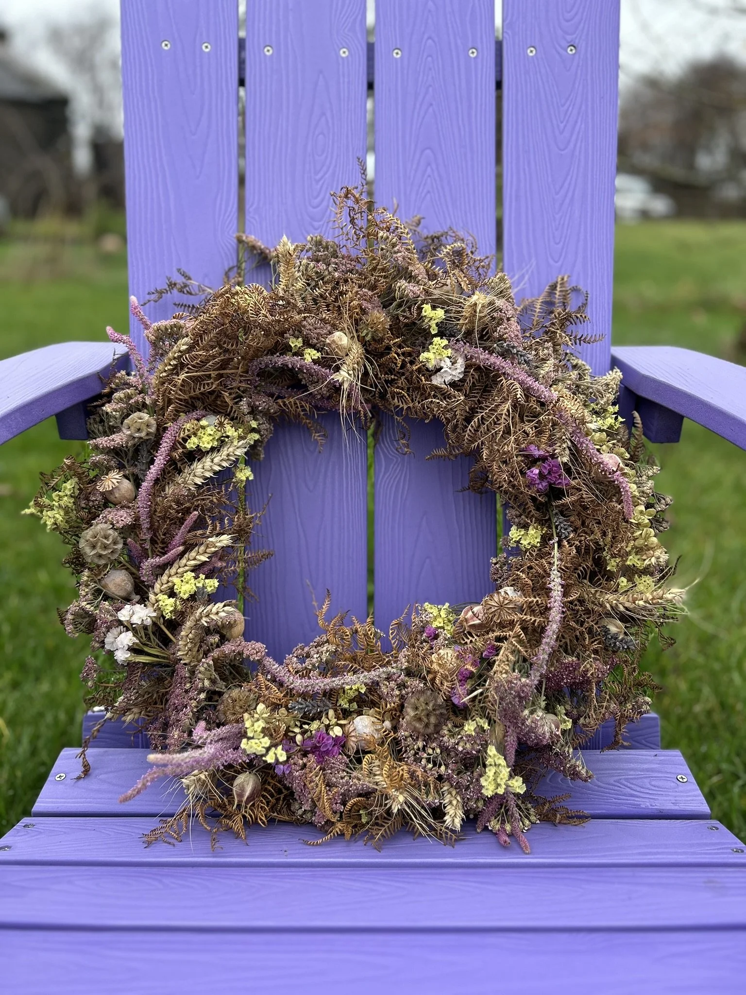 Created from flowers dried on the farm over the season. Each individual wreath will look beautiful at home over the winter. They can be placed in the compost as they are made from willow bases, string and flowers from our farm.